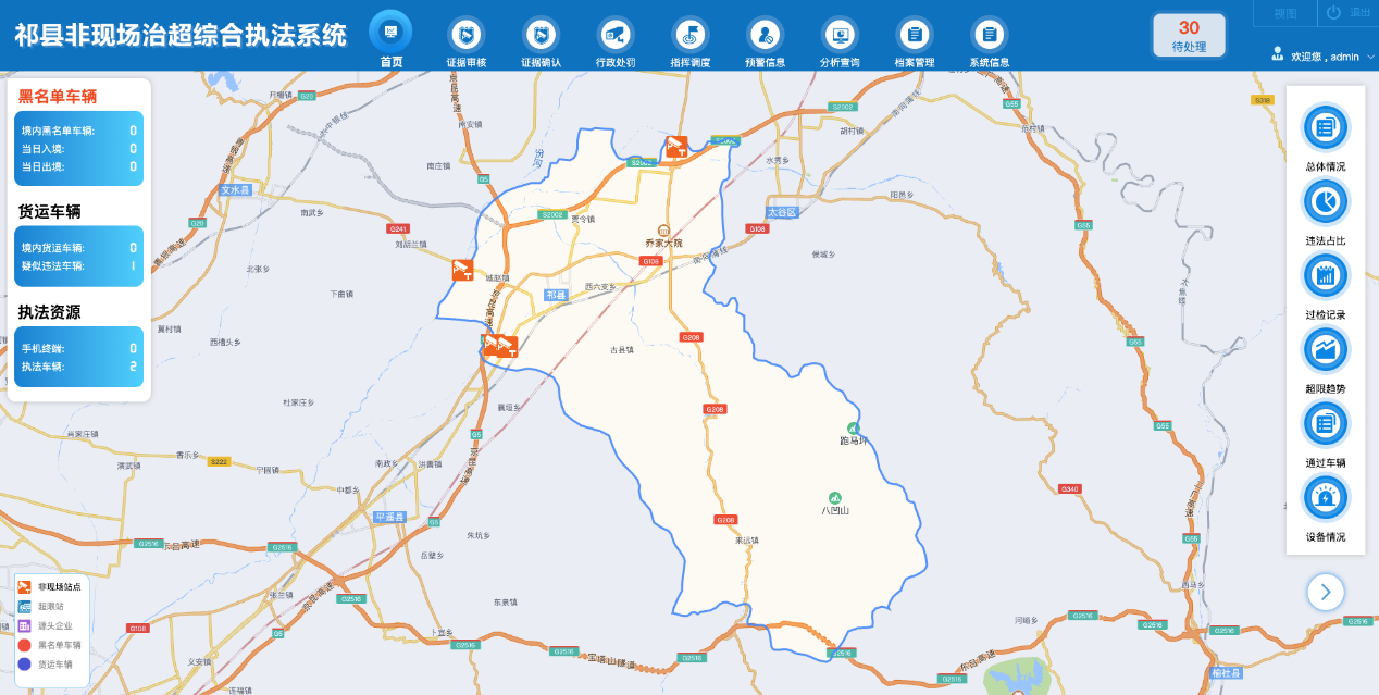 综合考虑祁县境内路网现状、既有治超设施、OD交通量调查分析,基于全域治超理念,应用物联网、大数据、云计算等核心应用技术,拟在全县境内布设四处非现场执法站点,对途经县域的货运车辆实施动态检测,采集违法信息,完善全县的综合治超网络。同时建设1套治超综合执法平台,接入全国货运车辆监管服务平台数据、全省大件运输审批数据、道路运政数据数据,实现电子围栏、黑名单报警及自动预警、指挥调度、车脸识别、源头追踪、证据保存及违法处罚、线上缴费、统计分析等诸多功能。